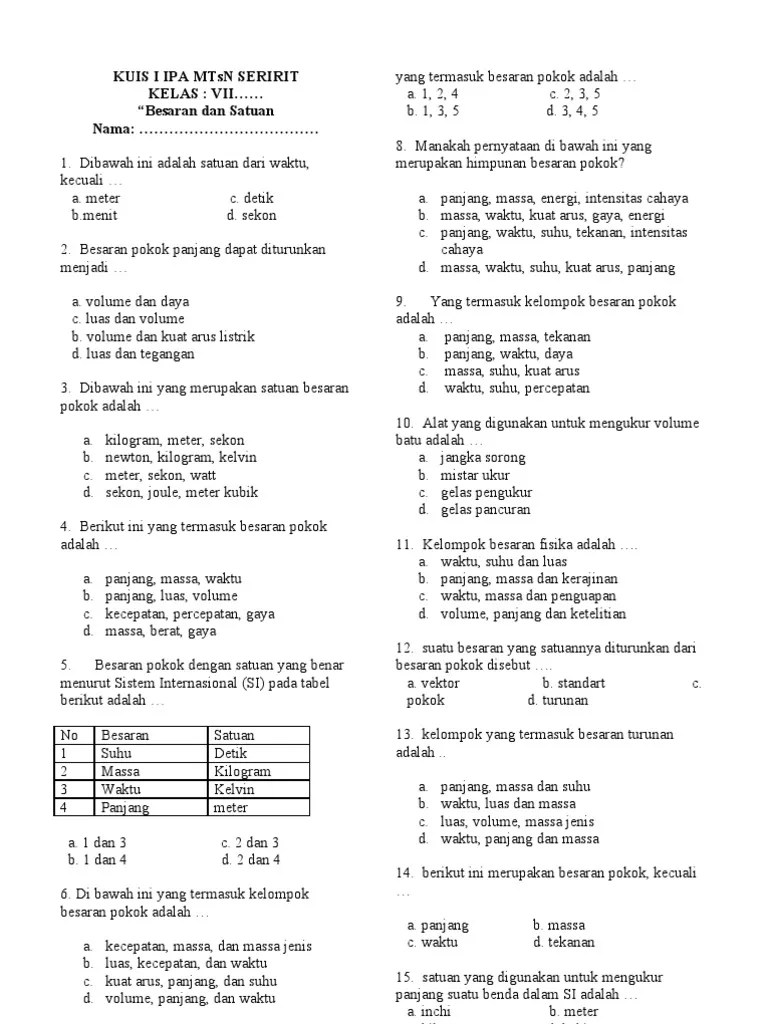 Setiawan2 besaran dan satuan perhatikan tabel be. Tentukan rumus → satuan → dimensi. Dari tabel di atas yang mempunyai satuan dan dimensi yang benar adalah . Prediksi 06 soal un ipa sd (plus kunci pembahasan). Contoh soal dan jawaban besaran dan satuan.htmlsoal besaran pokok dan besaran turunan disertai kunci jawaban pengukuran besaran pokok besaran turunan dan .